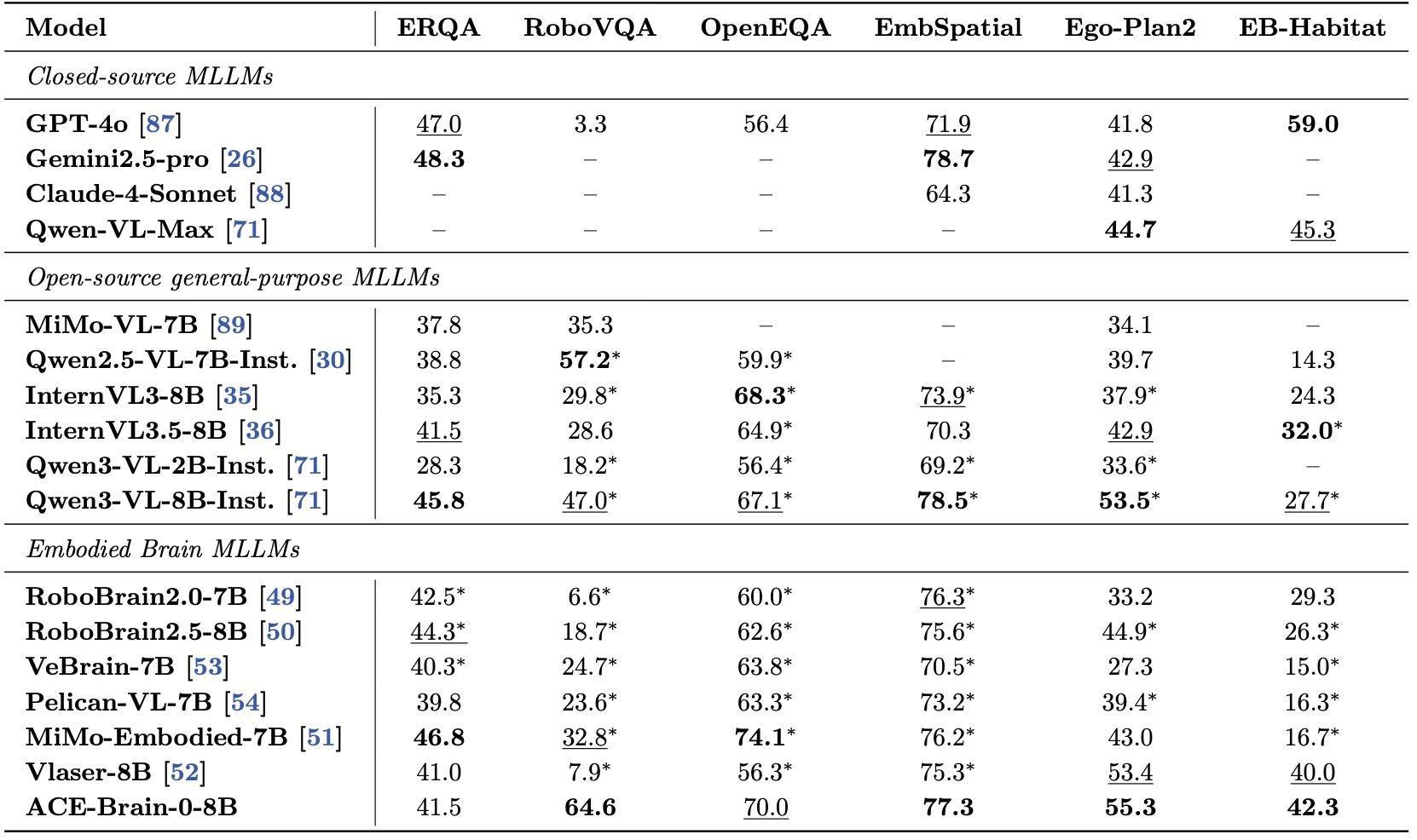 具身交互领域:ACE-Brain-0在4个具身benchmark上均表现出稳定优势,包括RoboVQA(机器人操作理解)、EmbSpatial(具身空间理解)、EgoPlan-Bench2(具身任务规划)、EB-Habitat(具身导航理解),尤其在机器人操作理解(RoboVQA)等关键能力上实现显著突破。