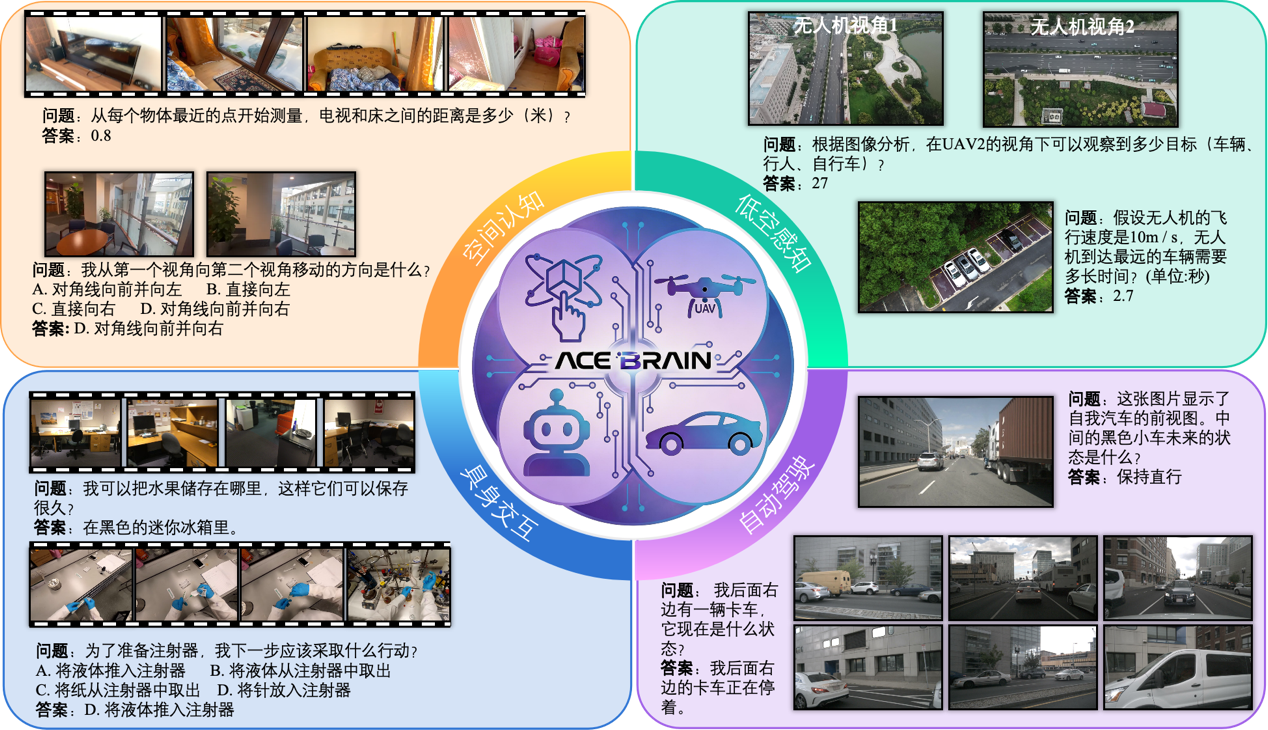 这套理论把一个深奥问题讲清楚了:为什么是“空间”,而不是别的? 因为空间不是一个普通任务,它更像是所有物理智能共同依赖的坐标系。无论是汽车在车道中判断前后左右,无人机从鸟瞰视角推理道路关系,还是机器人在房间里判断物体位置,它们都必须先拥有一种内部“空间地图”。ACE-Brain-0就是把这种“内部地图”从隐含假设提升成了方法设计的起点。
