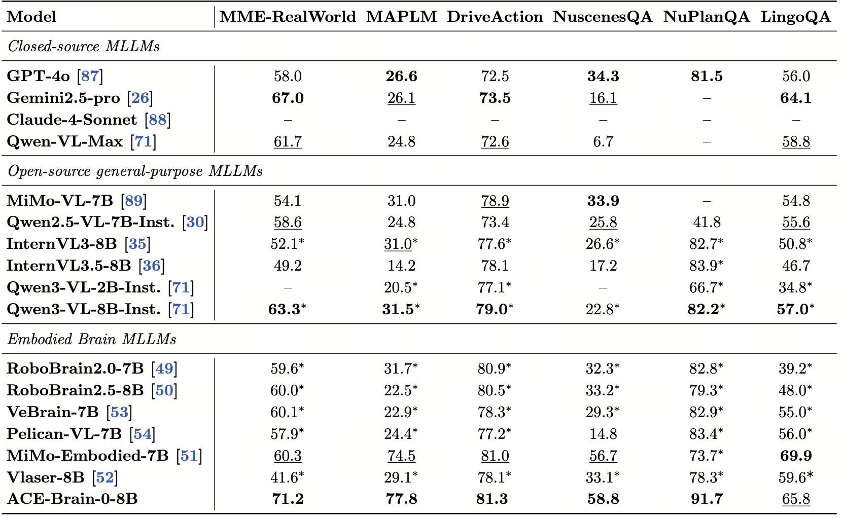 自动驾驶领域:ACE-Brain-0在5个自动驾驶 benchmark 上均取得领先表现,分别是MME-RealWorld(真实驾驶场景理解)、MAPLM(地图与道路结构理解)、DriveAction(驾驶行为理解)、NuscenesQA(多视图动态场景理解)、NuPlanQA(规划与交通规则理解),尤其在真实驾驶场景理解(MME-RealWorld)和规划推理能力(NuPlanQA) 等关键能力上实现显著提升。