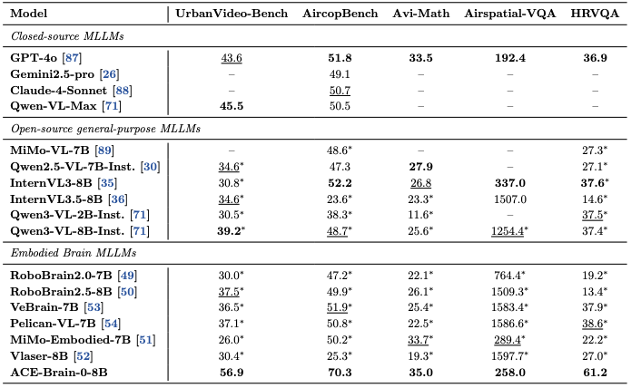 低空感知领域:ACE-Brain-0在5个低空视觉benchmark上均取得显著领先表现,包括UrbanVideo-Bench(城市级无人机场景理解)、AirCopBench(空中交通关系理解和多无人机视角协同理解)、AVI-Math(空中几何推理与数值计算)、Airspatial-VQA(低空空间视觉问答)、HIRVQA(遥感视觉问答),尤其在城市级无人机场景理解(UrbanVideo-Bench)和空中交通关系推理(AirCopBench) 等关键能力上实现大幅提升。