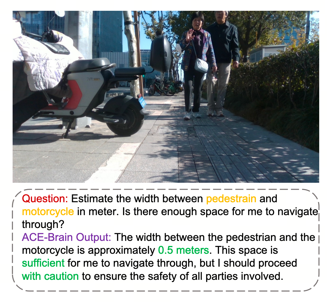 在城市人行道等复杂公共场景中,搭载 ACE-Brain 的机器狗展现出卓越的导航与VLA能力。以图片场景为例,面对“估算行人和摩托车间距、判断是否有足够空间导航通过”的需求,ACE-Brain赋能机器狗精准完成三大核心动作: