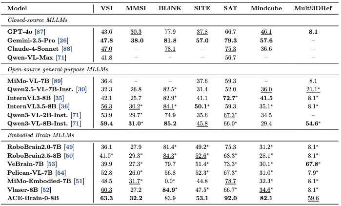 空间认知领域:ACE-Brain-0参与了7项空间认知领域的权威基准评测,在具身智能模型阵营中斩获5项 SOTA, VSI(视觉空间智能)、MMSI(多模态空间智能)、SITE(空间语言理解)、SAT(空间视角变换)、Mindcube(受限视角三维建模)代表了不同维度的核心空间能力。