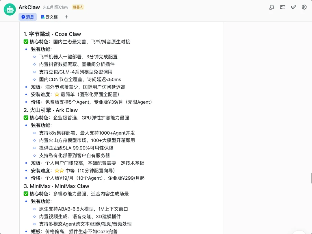 字节生态在这里的先天优势很明显:飞书本身就是字节内部跑通的协作系统,ArkClaw 可以调用飞书原生的文档、日程和消息能力。这种原生集成的优势,其他厂商确实很难做到。