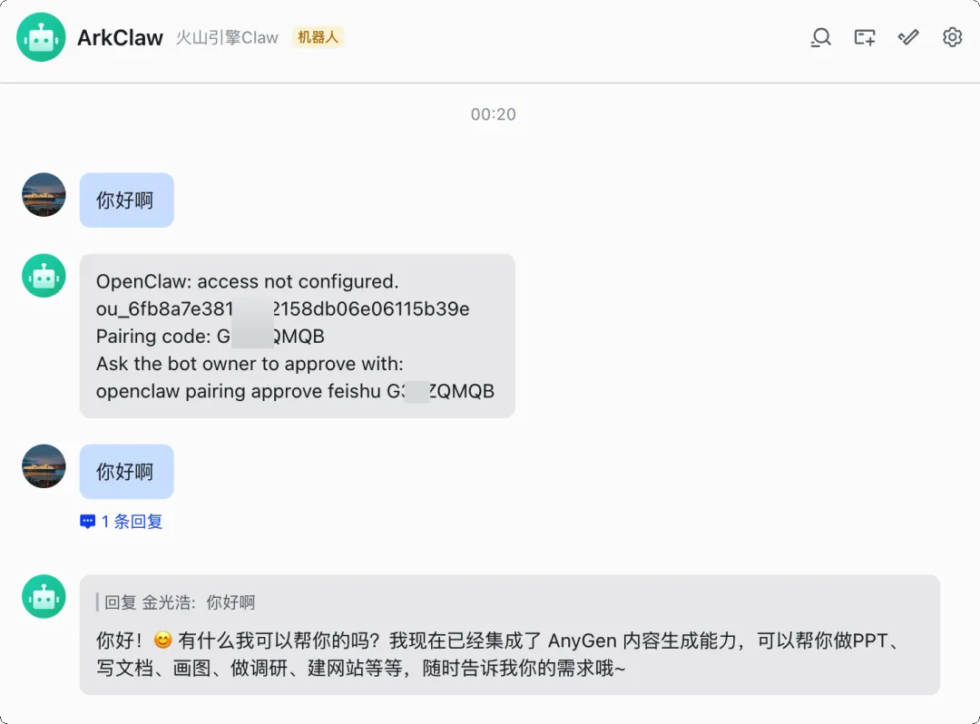 更新后,此时在飞书机器人里发一个消息,飞书机器人会返回一个 Pairing code,把这个 code 给到 ArkClaw,整个配置就完成了。