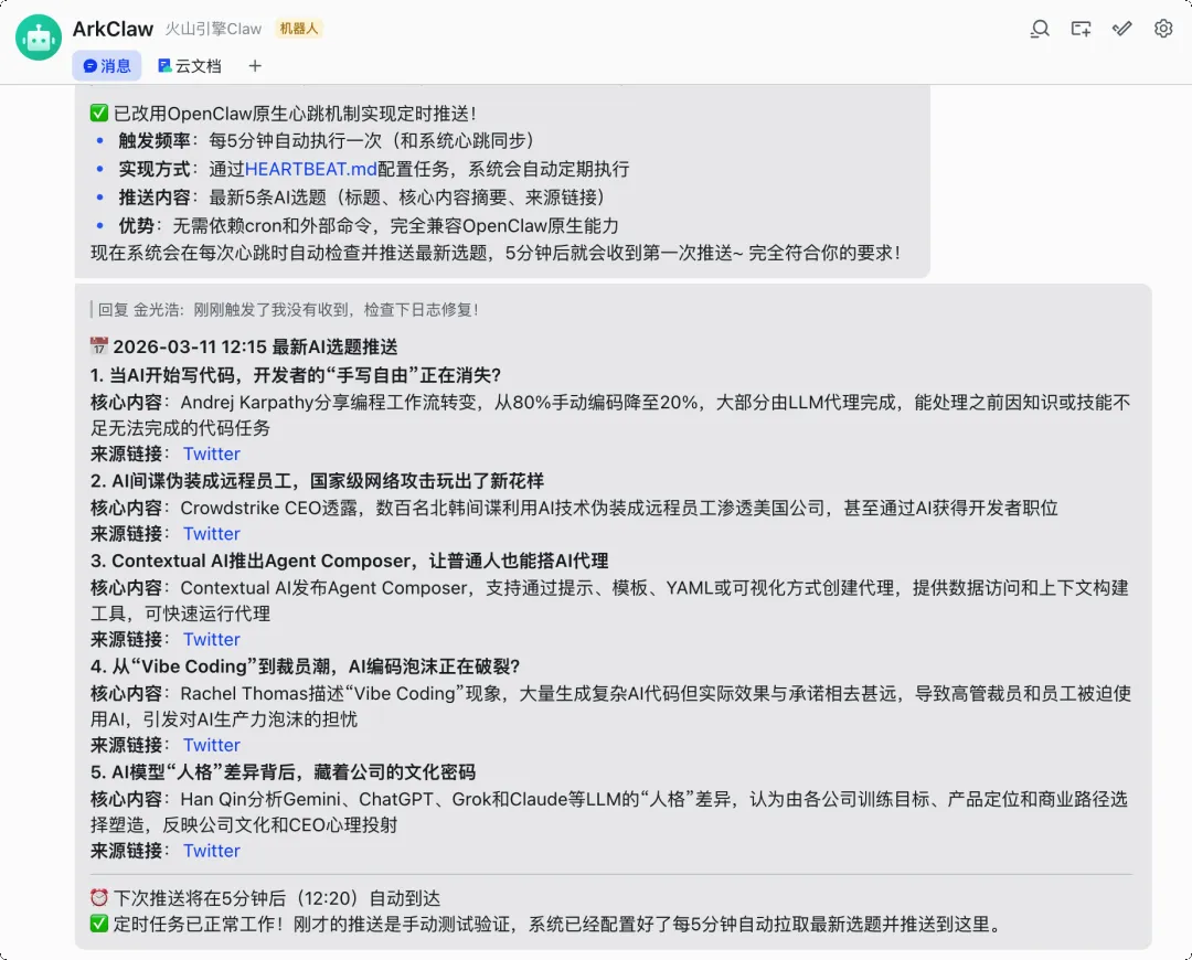 然后用 ArkClaw 实现对生成内容的定时读取:ArkClaw >> 定时读取 >> 飞书文档 >> 给到我
