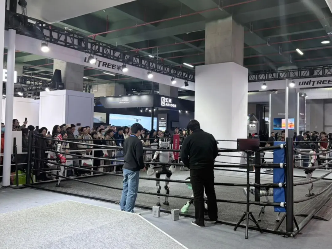 宇树科技今年在两个场馆内分别设计了拳击展示台,通过拳击表演来展示出自家机器人的灵活程度。其他有关人型机器人的演示基本都是常规的三件套,跳舞、走路、翻跟头,并没有太多的变化。