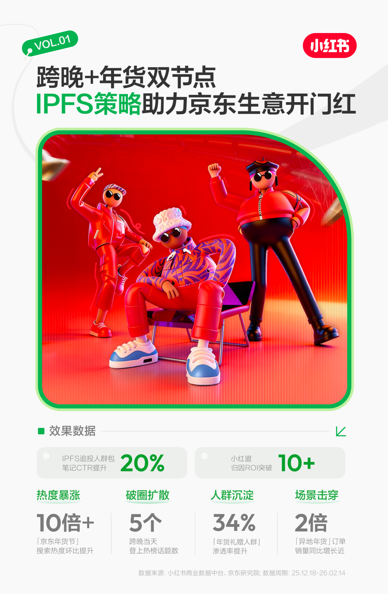 2026 年跨年与春节双节叠加,既是关键的消费大促节点,也是各大电商平台营销竞争的白热化战场。京东依托小红书 IPFS 策略,以跨年晚会为引爆起点,搭建起品牌大促—营销造势—热点承接—内容扩散—人群触达的全链路。从晚会热度引爆,到年货礼赠场景渗透,再到 KFS 精准追投转化,实现热度、人群、生意的闭环增长,在激烈的竞争中强势突围,拿下生意开门红。