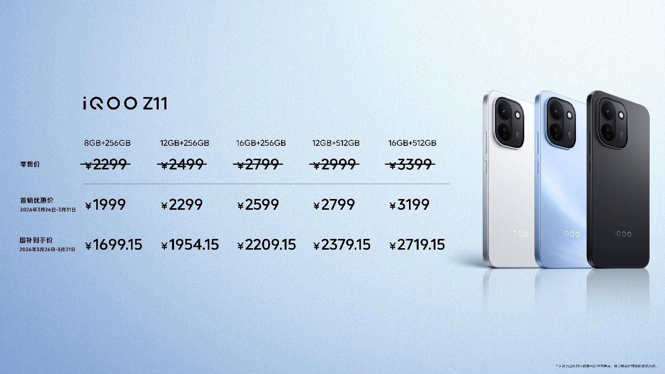 2026 年 3 月 26 日,「性能续航小超人」iQOO Z11 系列正式发布并已全渠道开售,首销补贴到手价 1499 元起,国补后到手价 1274.15 元起。