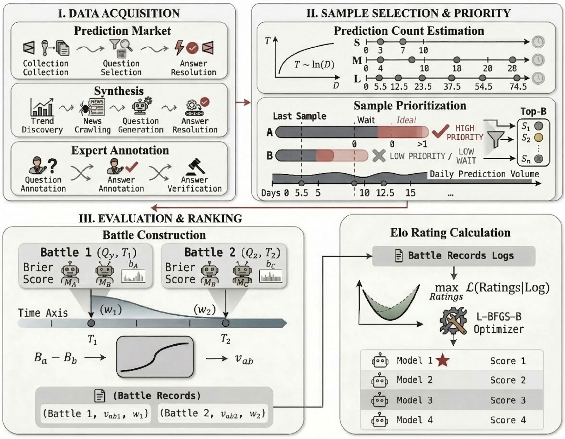 这是解决时序不对称问题的关键环节。评测使用 point-aligned Elo 机制:严格只比较"同一道题、同一预测时间点"的结果。所有参赛模型在完全相同的信息上下文下对决,公平性由此建立。