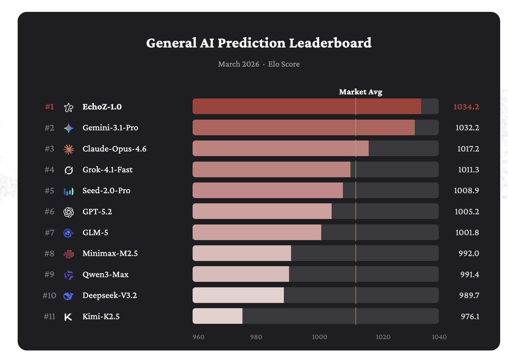 在 General AI Prediction Leaderboard 上(2026 年 3 月数据),EchoZ-1.0 以 Elo 1034.2 排名第一,领先 Google 的 Gemini-3.1-Pro(1032.2)和 Anthropic 的 Claude-Opus-4.6(1017.2)。排行榜涵盖 12 个模型,覆盖政治、经济、体育、科技、加密货币等 7 个领域,活跃题目超过 1000 道。