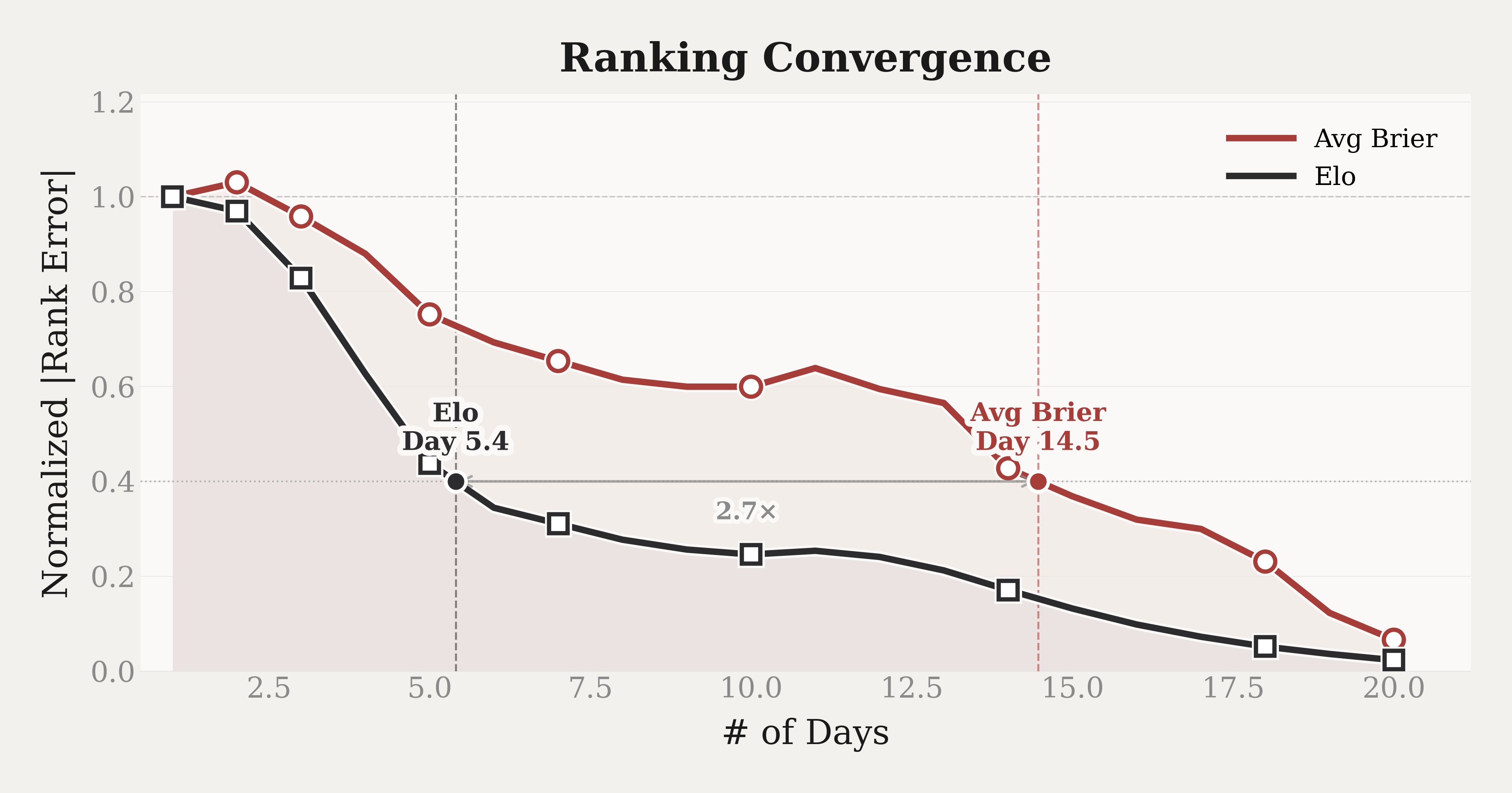 基于 Bradley-Terry MLE 算法计算全局排名。实验数据显示,这套框架对新加入模型的排名收敛速度是传统 Avg Brier 方法的 2.7 倍。