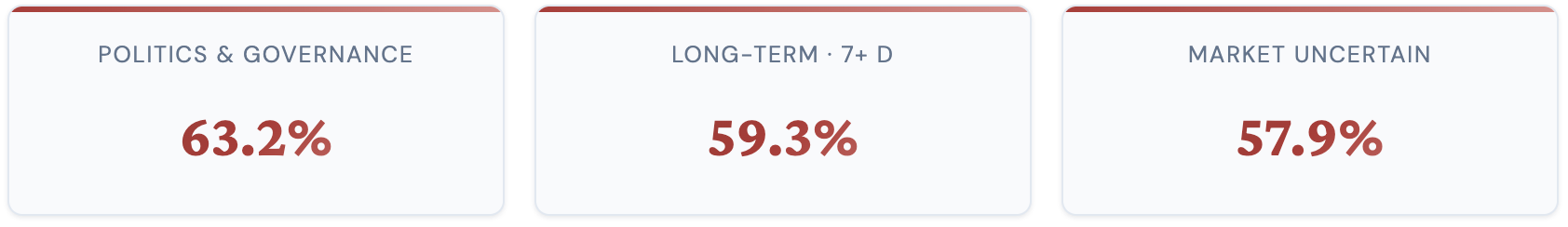 那么,EchoZ 对人类预测者的实际优势有多大?Unipat AI 给出了一组分层对比:将 EchoZ 与人类市场在同一预测批次中的同一问题上进行比较,基于 Brier Score 计算胜率,按领域、预测期限和市场不确定性三个维度展开: