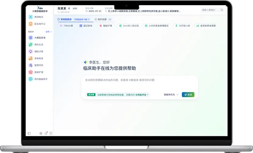 这些智能体并非凭空构建,而是从院内场景迁移而来。过去几年,医渡科技与 中山大学肿瘤防治中心、北京大学肿瘤医院、北京协和医院 等顶级医院合作,在真实诊疗环节中打磨了 超过 200 个专科智能体,覆盖肿瘤、心血管、全科 等多个方向。这些智能体曾嵌入门诊医生工作站,与医生协同完成肿瘤分期、治疗方案推荐、风险评估等任务,完成了深度临床验证。