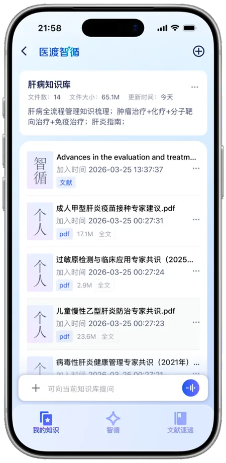 医渡智循的个人版则通过 个人知识库功能,打造专属于医生的「移动循证书房」 。医生可在个人知识库中自主收藏、上传认可的指南文献、专科共识,按个人诊疗习惯与研究方向分类整理,形成个性化的知识空间;在临床查询时,系统可优先匹配个人知识库中的内容,实现权威通用知识与医生个人经验的有机结合。无论是门诊间隙的快速查询、院外的病例分析,还是科研时的文献梳理,个人知识库都能让循证检索更贴合医生的个体需求,大幅提升使用效率。