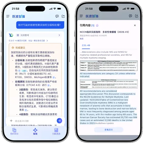 然而,技术手段难以做到绝对的零幻觉,医疗场景的严肃性又要求必须有兜底方案。医渡智循将产品层面的溯源能力做到极致: 生成内容的溯源粒度细化到「句号」级别 ,每一句话都能精准关联到对应的权威来源,且原文中匹配的核心内容会做高亮展示。这意味着,即便存在极少数极端情况,医生也能以极低成本快速完成人工校验。