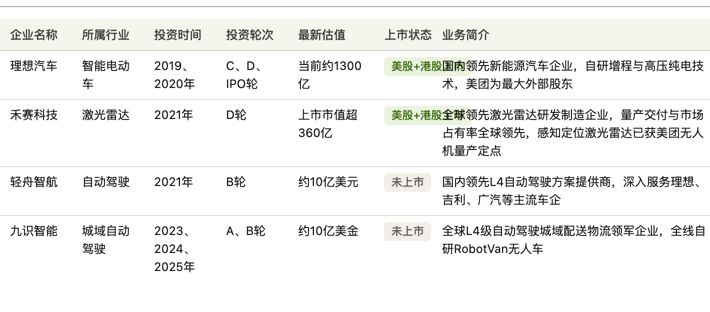 理想汽车是重要的一笔。美团早在 2019 年理想汽车的 C 轮就已入场,随后又参与了 D 轮和 IPO,成为理想汽车最大的外部股东。如今理想汽车美股、港股双上市,当前市值约 1300 亿。