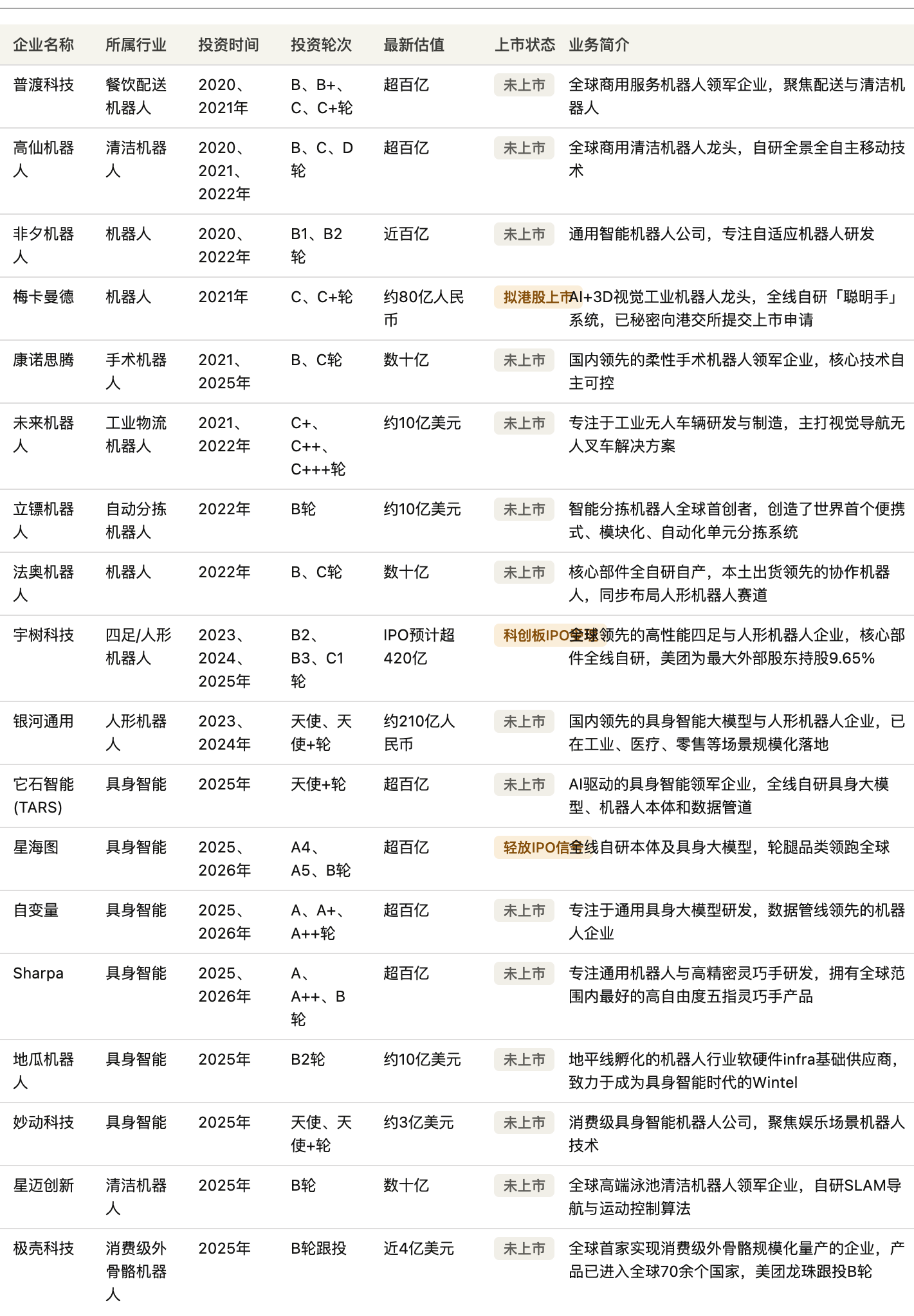 在美团的整张投资版图里,具身智能是美团布局最早、投资企业最多,且覆盖最全的一个赛道。从餐饮配送机器人、清洁机器人、工业物流机器人、仓储分拣机器人,美团几乎覆盖了机器人赛道所有可落地的主流场景。截至目前,美团在具身智能领域至少投资了 16 家企业,其中 3 家已开始推进上市进程。