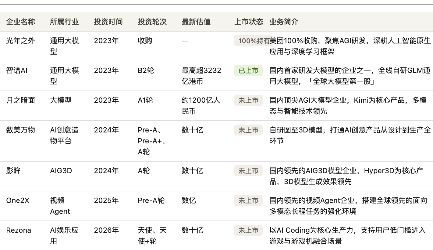 今年年初,一些乘着 AI 东风的新秀企业开启上市计划。宇树科技科创板 IPO 获受理,市值预估超 420 亿;智谱 AI 港股上市,市值曾冲高到 3200 亿;摩尔线程上市首日市值突破 3000 亿,沐曦股份市值也曾突破过 2800 亿。如果你仔细看过这些公司的股权结构,就会发现一件有意思的事:这些公司背后,都藏着同一个名字——美团。