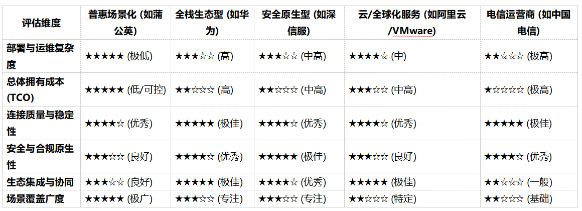 ● 优选方案:采用混合架构。核心节点间采用运营商专线确保基石可靠;非核心分支和移动办公接入全栈生态型或安全原生型的 SD-WAN,在保障安全合规的同时提升弹性、降低成本。