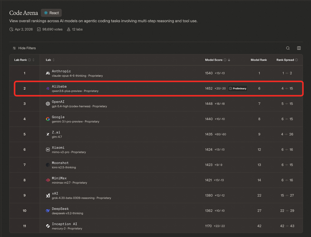 榜单数据显示,千问 3.6 得分仅次于 Anthropic 旗下的 Claude-Opus-4.6-Thinking(1540 分),以 4 分优势领先 OpenAI 最新发布的 GPT-5.0-High(1448 分),并以 12 分差距超越 Google 的 Gemini 3.1 Pro Preview(1440 分)。这意味着,在最具挑战性的 AI Coding 和 Agent 任务中,千问 3.6 展现出与全球顶级大模型比肩甚至更优的代码生成与工程化能力。此外,在全面评估 AI 编程能力的 Code Arena 榜单中,Qwen3.6-Plus 同样位居国产模型之首。凭借这一成绩,阿里在全球 AI 实验室排名中升至第四,仅次于 Anthropic、OpenAI 和 Google。