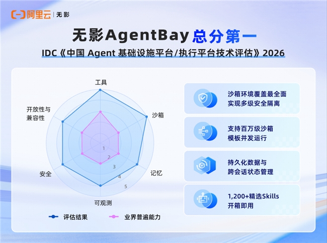 4 月 9 日消息,国际权威咨询机构 IDC 正式发布《中国 Agent 基础设施平台/执行平台技术评估,2026》报告,凭借在沙箱、工具、记忆、可观测、安全、开放性与兼容性六大核心维度的卓越表现,阿里云无影 Agentbay 斩获总分第一,全面领跑中国 Agent 基础设施市场。
