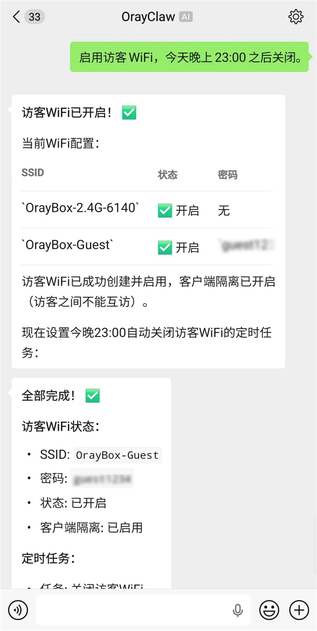 传统方式下,这类操作往往需要登录后台,手动创建访客网络,再设置名称、密码和关闭时间;而现在,只要说一句:「启用访客 WiFi,今天晚上 23:00 之后关闭。」OrayClaw 就可以自动完成访客网络创建,并设置好定时任务,在约定时间后自动关闭。