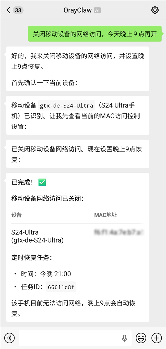 对于不熟悉网络设置的人来说,这类过程不仅繁琐,而且容易出错。而在 X1 Pro 内置 OrayClaw 的情况下,你只需要说:「关闭 XXX 设备的网络访问,晚上 9 点再开。」OrayClaw 就可以先识别目标设备,再执行断网,并同步设置恢复时间。
