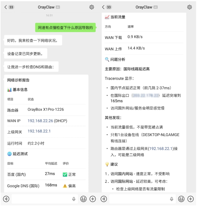 OrayClaw 就可以自动调用相关能力,对当前设备列表、流量占用、延迟、丢包、DNS 响应等情况进行综合诊断,并将结果以更直观的方式反馈。