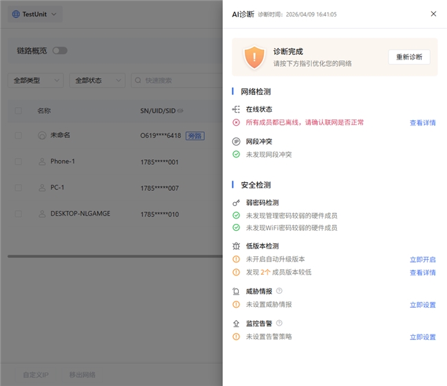同时,蒲公英管理平台还提供一键 AI 诊断功能,从在线成员、网络冲突、访问策略,到弱密码、威胁情报与告警策略,系统会自动完成检测、分析与汇总,并以清晰的状态结果呈现给管理员。