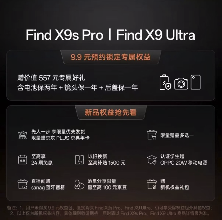 来京东预约 OPPO Find X9s Pro、OPPO Find X9 Ultra,9.9 元预约锁定专属权益,赠价值 557 元专属好礼,含电池保两年、镜头保一年、后盖保一年。此外,预约 OPPO Find X9 Ultra 还可享专属权益三选一,包括漫游拍档礼盒、X3 SE 云台摄影套装、OPPO 蓝牙耳机;预约 OPPO Find X9s Pro 享专属权益五选一,包括孙颖莎定制礼盒、漫游拍档礼盒、OPPO 蓝牙耳机、多功能变焦摄影套装、双反复古口袋相机。来京东下 OPPO Find X9 Ultra、OPPO Find X9s Pro,可享至高 24 期免息、以旧换新至高补贴 1500 元、直播间赠 sanag 蓝牙音箱、认证学生赠 OPPO 20W 移动电源等等。