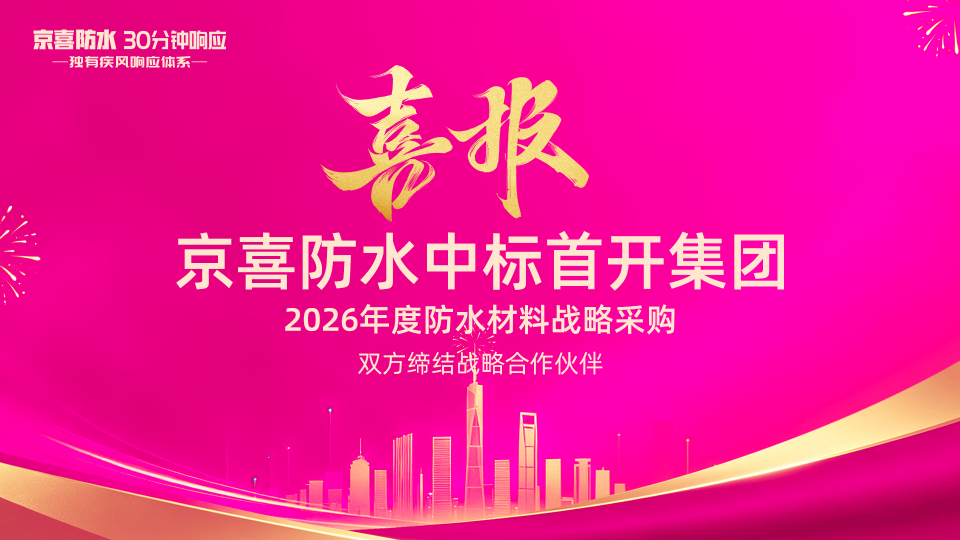 近日,京喜防水成功中标北京首都开发控股(集团)有限公司(以下简称「首开集团」)2026 年年度防水材料战略采购项目,正式成为这家标杆国企的核心防水材料供应商。此次中标,既是国企对京喜防水产品实力、服务水平的高度认可,更是京喜防水践行「30 分钟响应」核心品牌定位、深耕防水领域 33 年实力积淀的重要见证。
