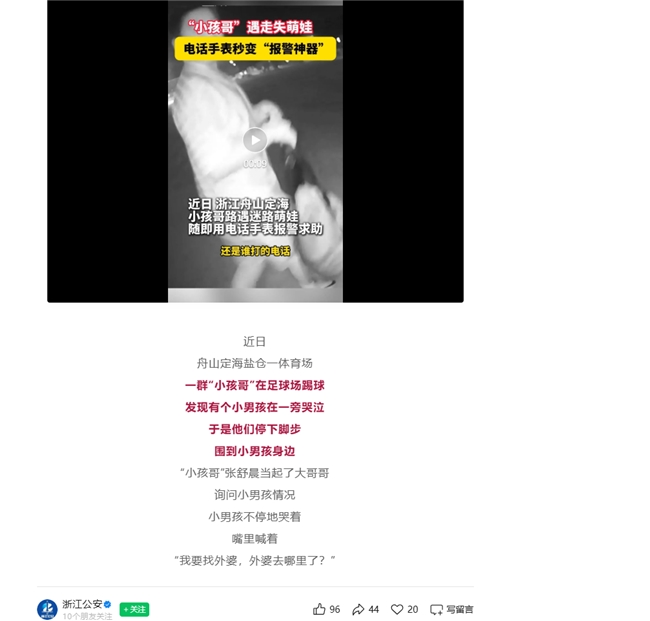 社交平台被一个儿童电话手表用户的真实分享刷屏,浙江舟山的「小孩哥」发现有个小朋友迷路了,随着用电话手表报警求助,然后警方找到他们,网友纷纷评论「小孩哥帮助小孩哥」,儿童电话手表已成为很多儿童安全与沟通的重要工具,再次引起很多网友共鸣。