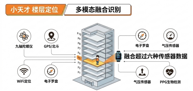 气压计仅仅是起点。为了对抗天气波动、空调系统对气压产生的扰动,小天才构建了一套多模态融合识别的楼层定位。这不再是单一传感器的读数,而是一次复杂的「多种传感器融合(Sensor Fusion),比如现在小天才最新的楼层定位已经融合超过六种传感器数据: