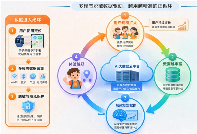 真正让小天才领先全球的,也不只是硬件传感器的丰富,也不是不只是技术架构,而是——小天才构建了一个持续自我强化的 AI 楼层定位大数据。所有定位数据在经过脱敏处理后,会进入云端模型进行优化。随着用户规模扩大,系统能够不断修正误差、补全环境信息。