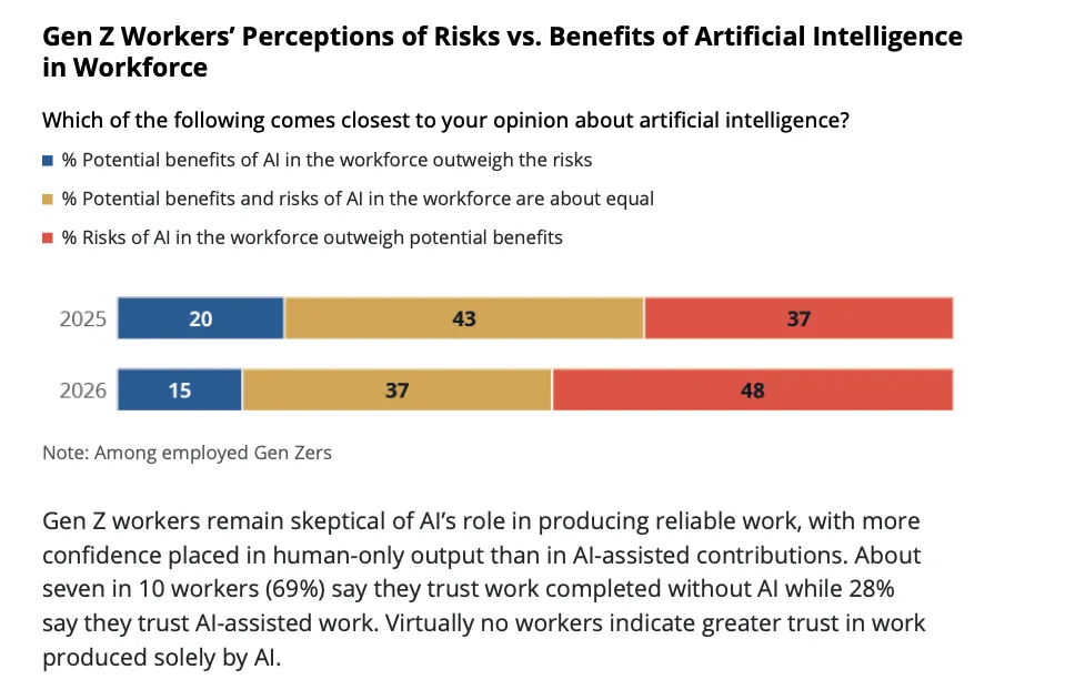 盖洛普数据显示,在已就业的 Z 世代中,高达 48% 的人认为 AI 在工作场所的风险远大于收益,这一比例在一年内激增了 11 个百分点。认为收益大于风险的仅占 15%。