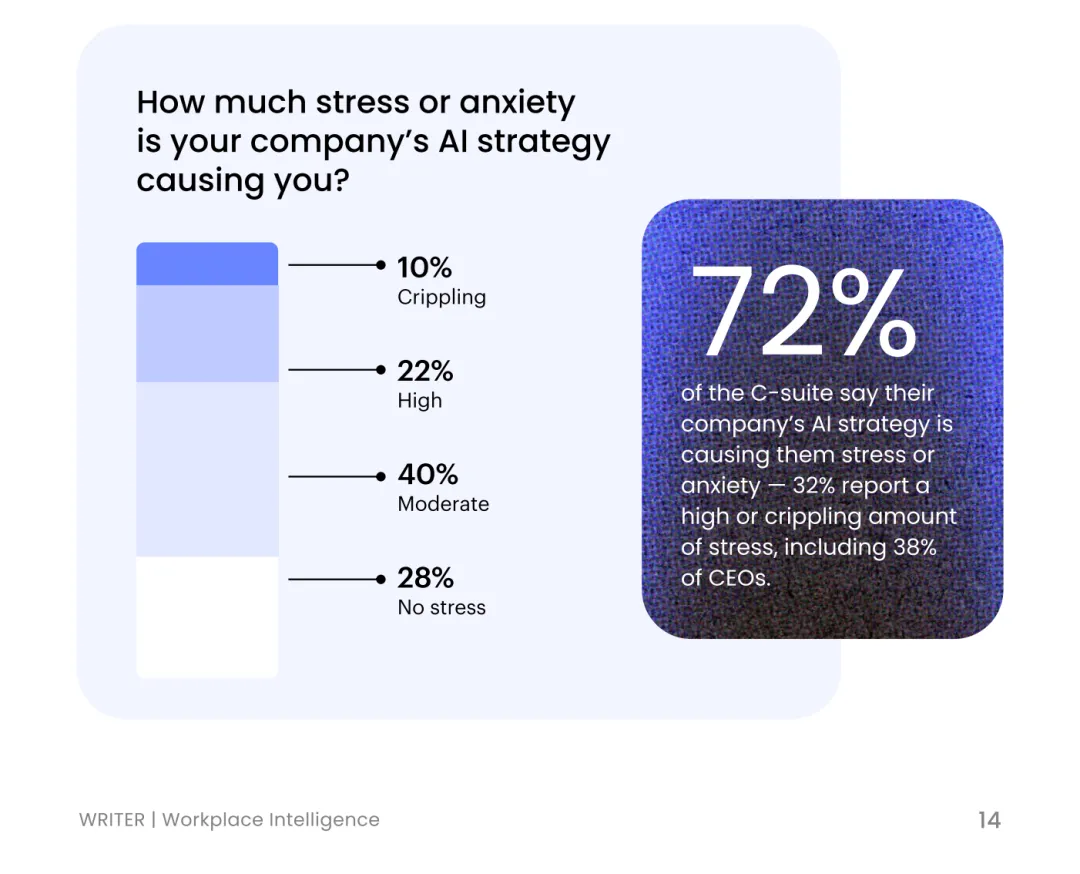 而且这种「FOBO」不只是对打工人,对强迫员工拥抱 AI 的管理层也是如此。Writer 报告中 69% 的公司正在因 AI 进行裁员,但其中 39% 的企业根本没想清楚怎么靠 AI 赚钱。连 73% 的 CEO 自己都因为 AI 战略感到焦虑。