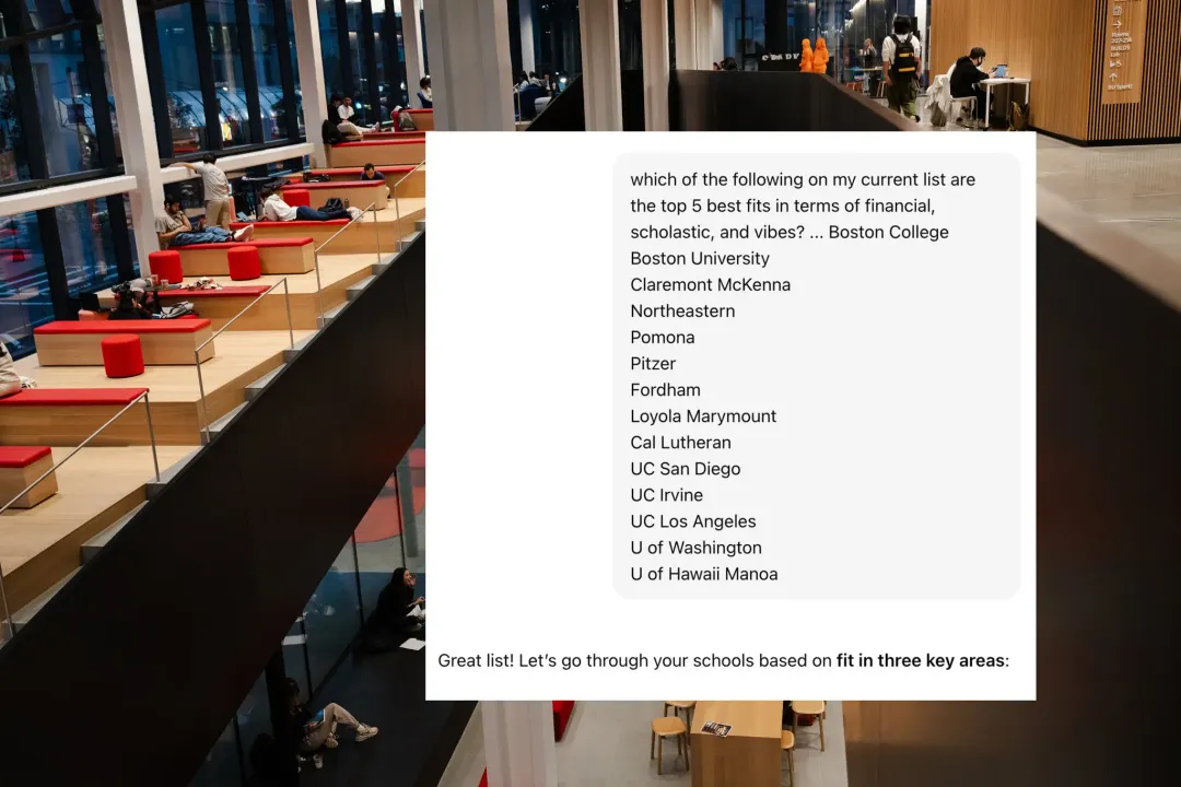 根据咨询机构 Ruffalo Noel Levitz 2024 年的调查,三分之一的高中生在使用 AI 规划大学申请。他们会让 AI 拉出一长串学校清单,把学费、奖学金、录取率整理成表格,用来快速做初筛,但他们不会让 AI 做判断。
