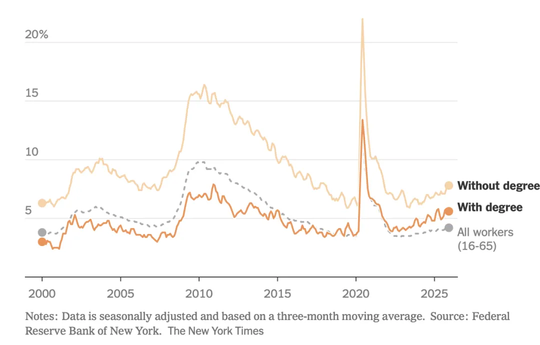 纽约联邦储备银行的数据显示,去年底, 22 至 27 岁大学毕业生的失业率飙升至 5.6%,远超整体失业率 。
