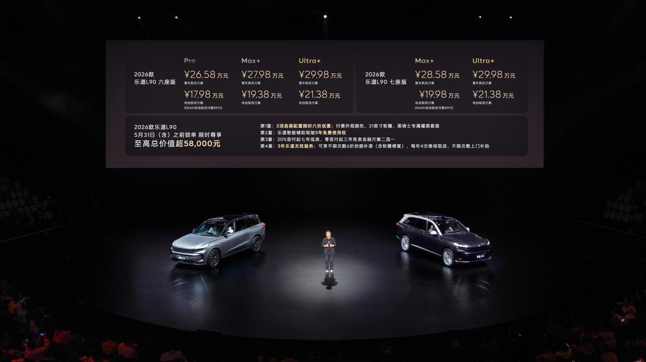 2026 年 4 月 21 日,乐道L90 智能焕新发布会在杭州举行,2026 款乐道L90 正式上市,官方指导价 26.58 万元起,采用 BaaS 电池租用方式购买,起售价 17.98 万元。