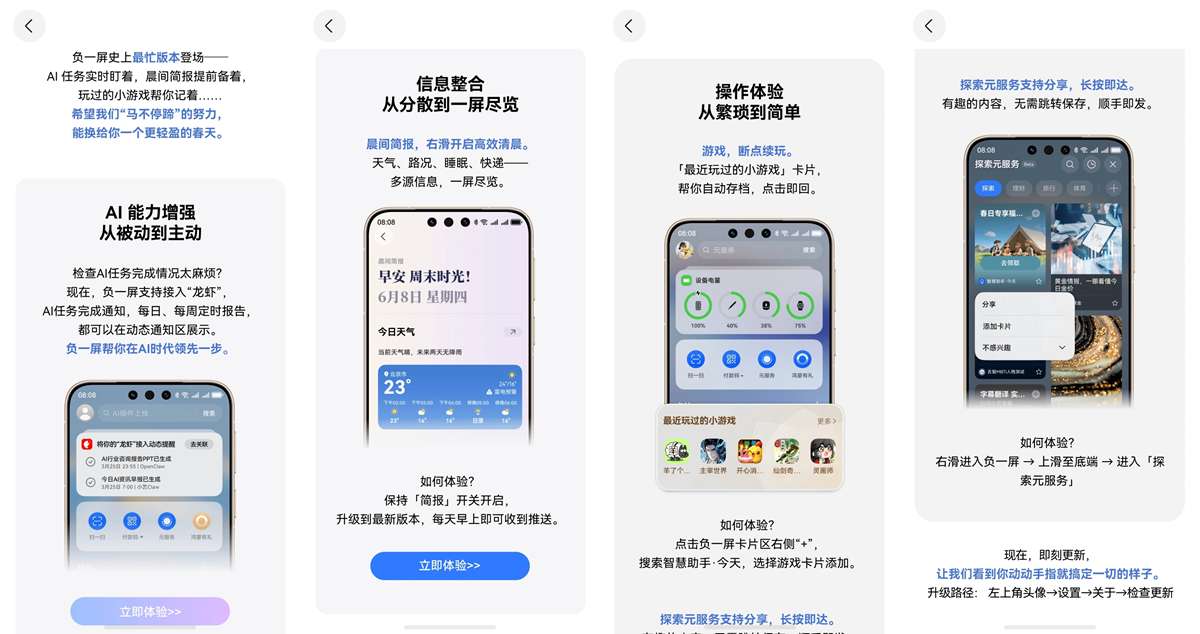换了华为手机半年多,发现鸿蒙真的是「越用越香」,系统不仅流畅丝滑,还有很多超好用的独家功能,在其他手机上是体验不到的。最近 HarmonyOS 6.1 开启更新,最圈粉我的负一屏也同步迎来春日版本升级:「龙虾」任务实时帮盯、晨间简报每日提醒……畅享春日松弛感。