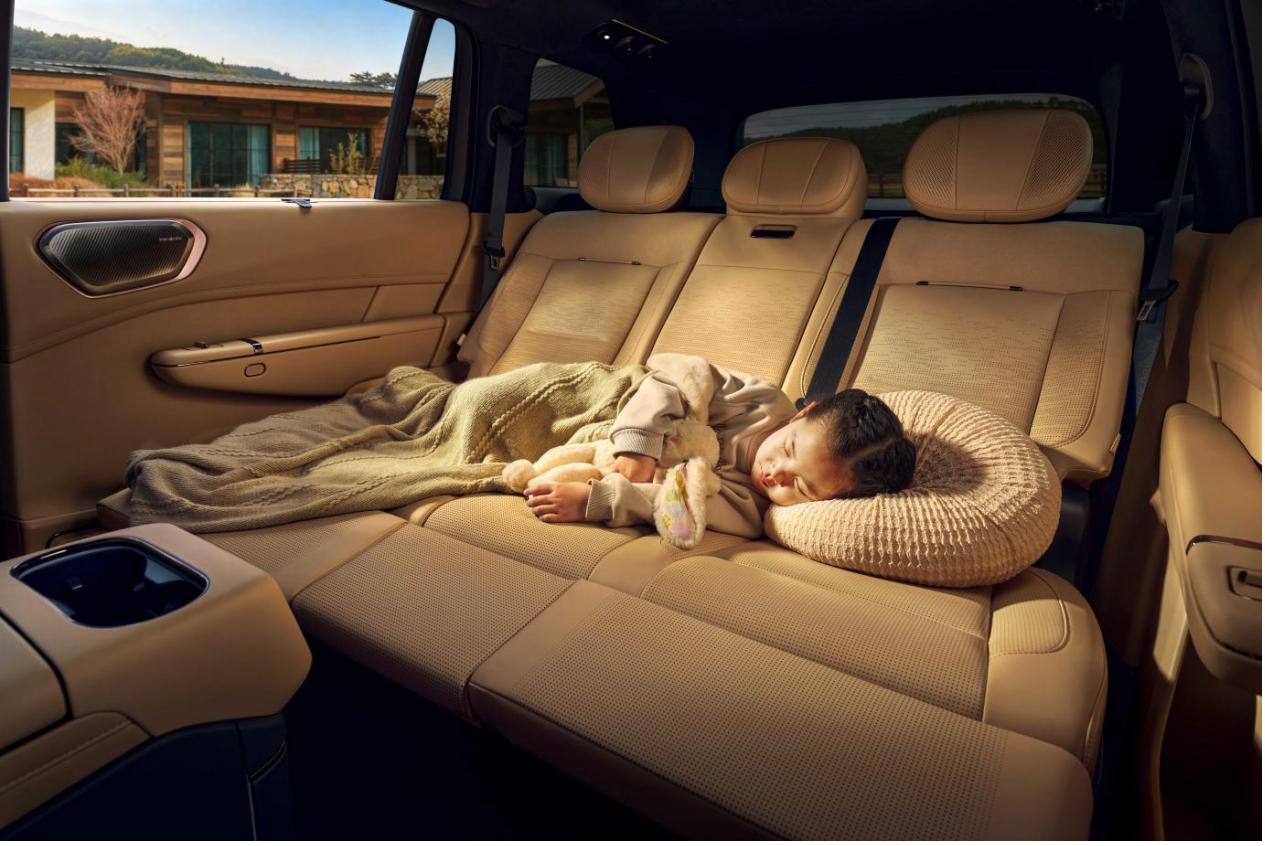 还有一个细节值得说——同级独有的二排儿童床模式。腿托抬升后与座垫高差不超过5毫米,形成一张1.35米×0.85米近乎纯平的支撑面,9岁以下的孩子可以舒服躺卧。