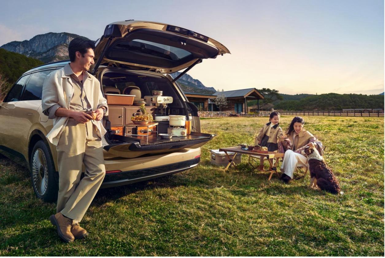 后备箱是另一个体感最直接的维度。1030L是基础容积,二排座椅前移后可拓展至1215L,纵深延伸至1350mm。18寸山地车、高尔夫球包、全套露营装备,理论上可以一车全装。中国品牌SUV首创的电动无界天地门,地门承重300公斤,打开之后就是一个户外观景平台。
