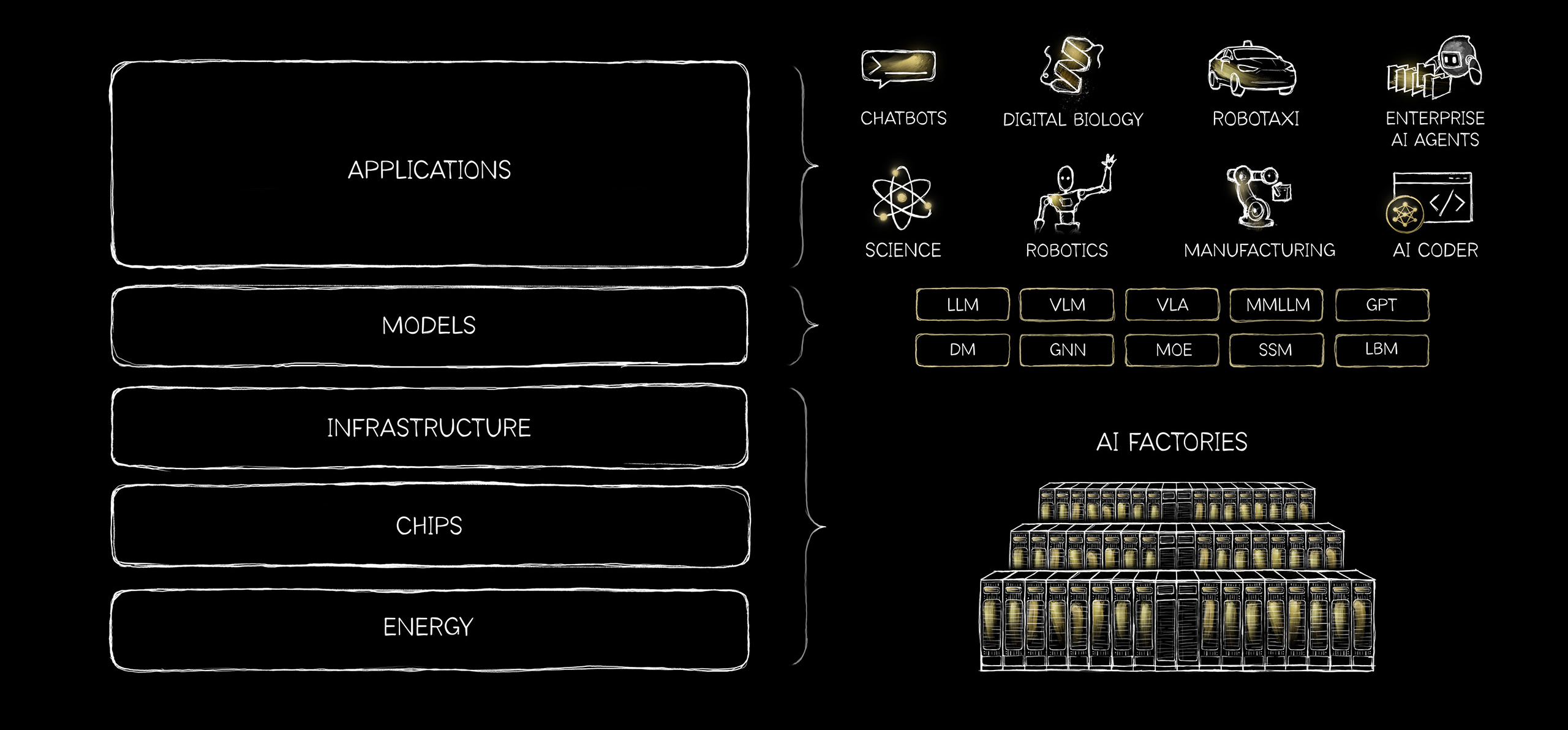 在教装展开幕前一个多月,2026年3月10日,黄仁勋在英伟达(NVIDIA)官方博客发布署名文章,标题为《AI Is a 5-Layer Cake》(AI是一块五层蛋糕)——这是他自2016年以来的第七篇公开长文。在这篇被全球科技产业广泛解读的文章中,黄仁勋将AI产业的完整架构定义为五层:自下而上,依次为能源、芯片、基础设施、模型和应用。